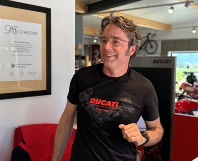 Ganz klein angefangen, kann Stephan alias "Der Meister" mittlerweile stolz die Marken Ducati und Honda präsentieren. Stephan, ein leidenschaftlicher Rennstreckenfahrer, Zweiradmechanikermeister und Verkäufer, der aus einem "Ein-Mann-Betrieb" eigener Vision und Kraft ein ganzes Unternehmen mit mehr als zehn Mitarbeitern aufgebaut hat.