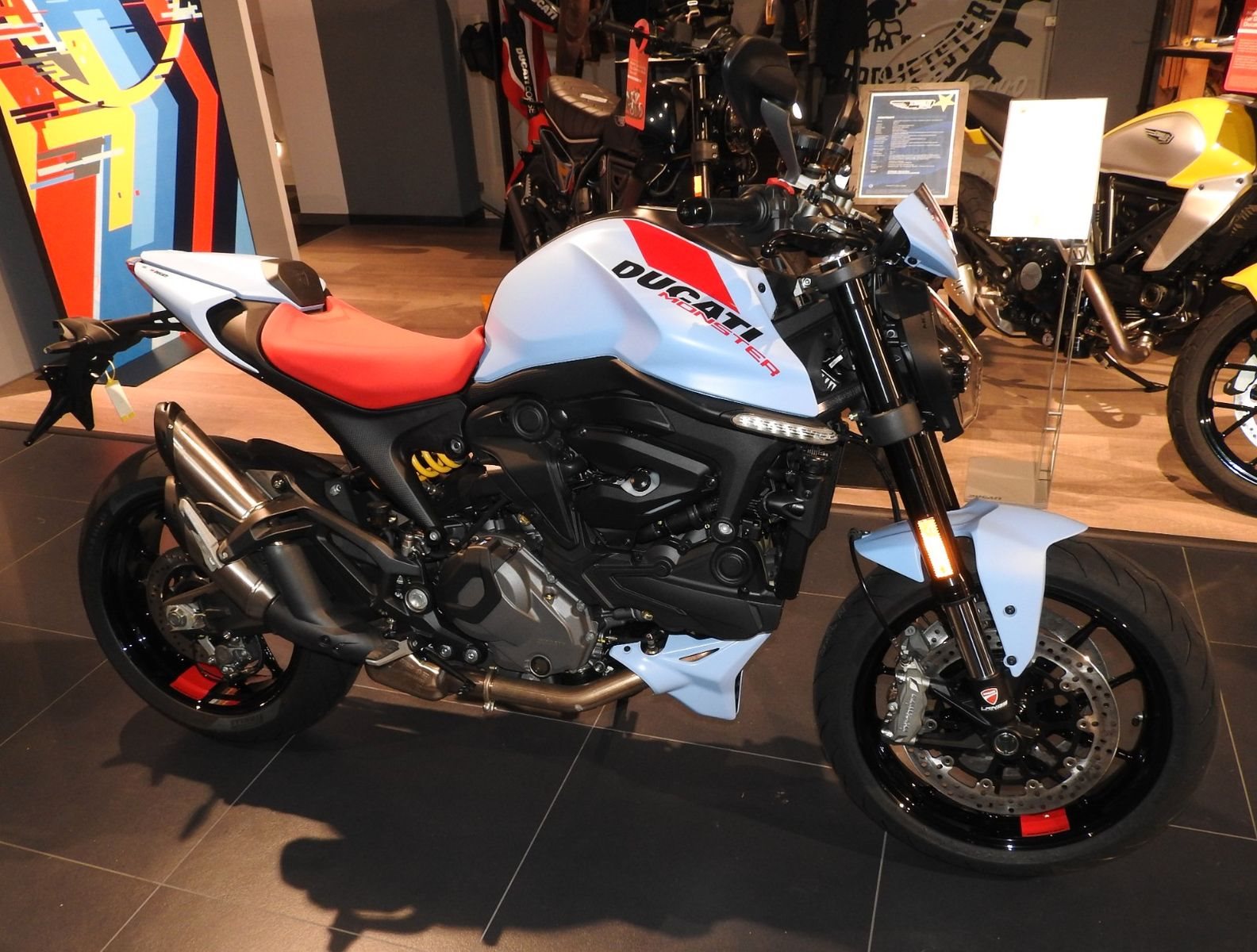 Die Monster ist mit dem Euro-5-zugelassenen 937 cm Testastretta 11°-Motor mit desmodromischer Steuerung ausgestattet. Mit einer Leistung von 111 PS bei 9250 U/min ist der Motor sanft und kontrolliert bei niedrigen Drehzahlen, um den Stadtverkehr ohne Zögern zu bewältigen, aber auch dynamisch bei mittleren und hohen Drehzahlen, für eine mitreißende Leistung in jeder Situation. Sein geringes Gewicht trägt zur Leichtigkeit des Motorrads bei und erhöht die Fahrbarkeit.