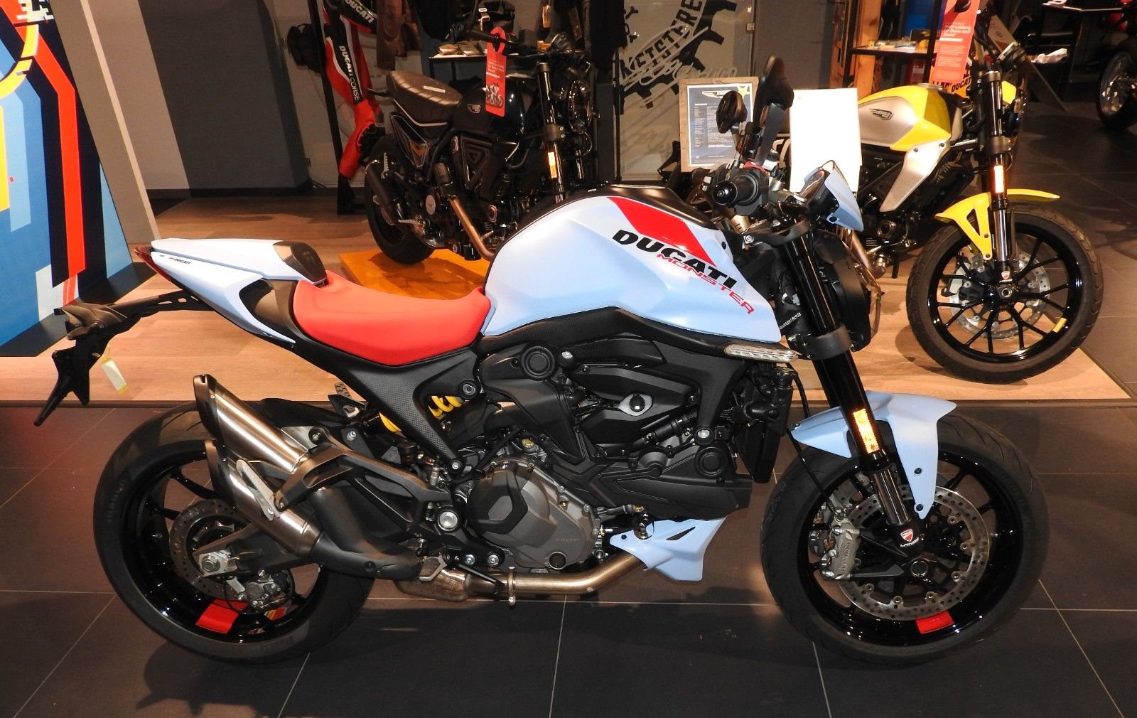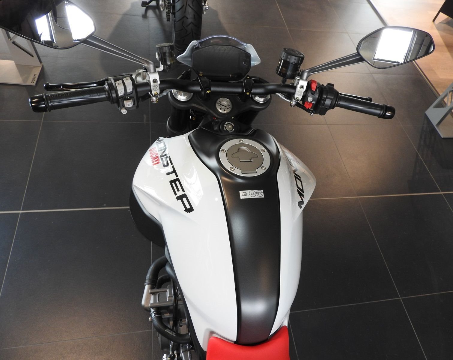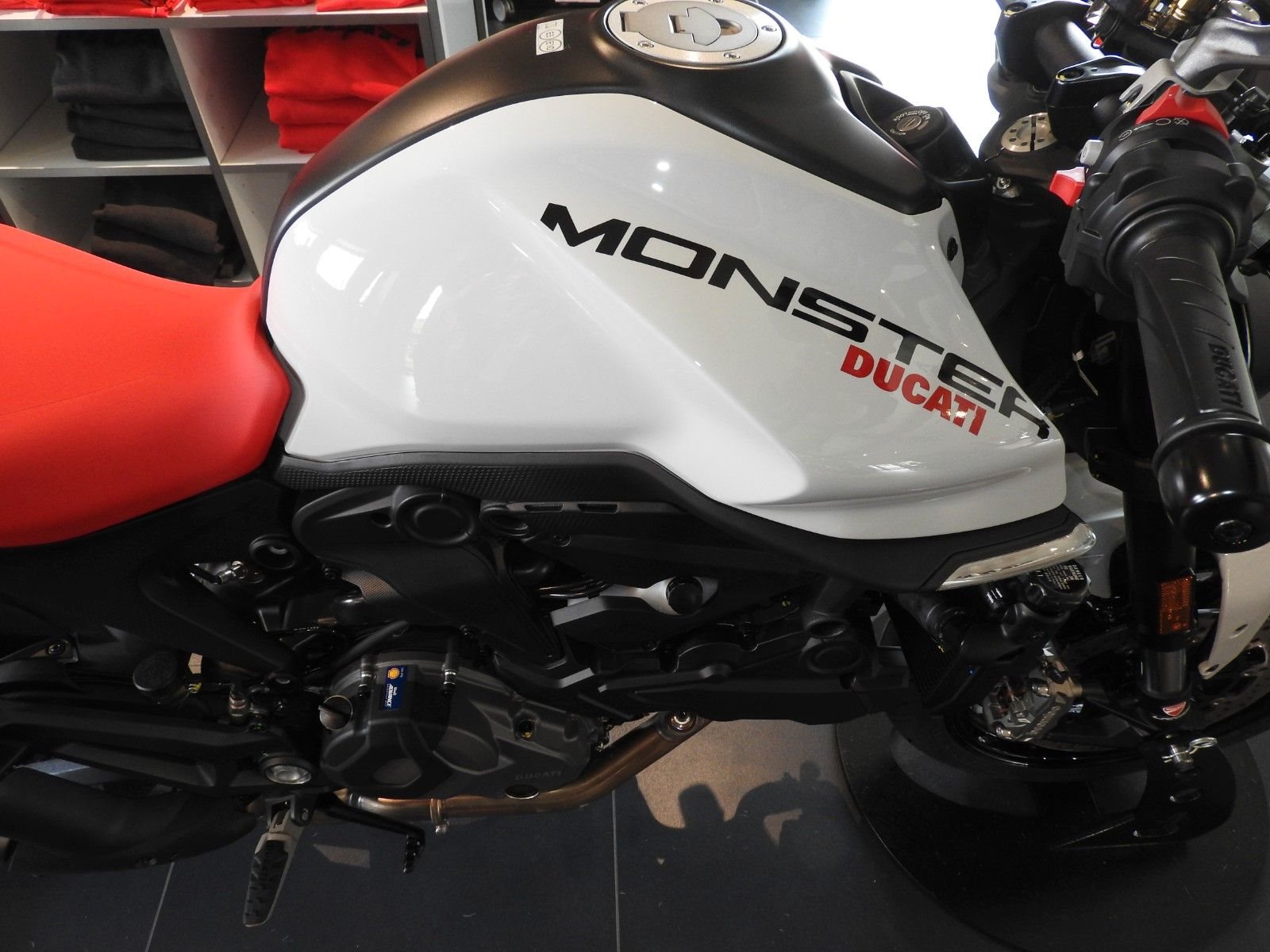 Zum Verkauf steht eine DUCATI Monster+ (Neufahrzeug, Iceberg White).