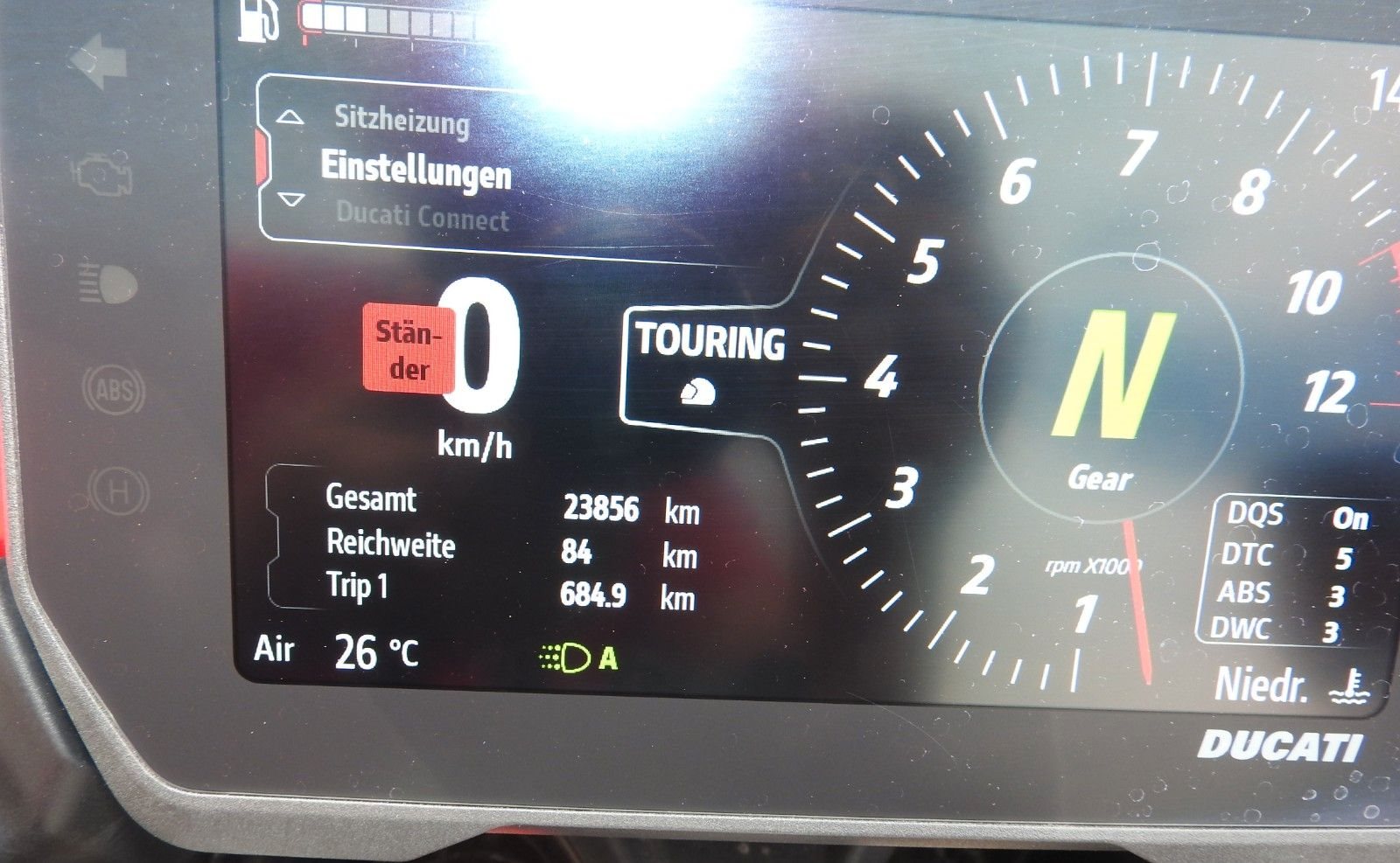 Serienausstattung: Ducati Skyhook Suspension, Minimum Preload System, Ducati Quick Shift, Tempomat, Hands-Free, beleuchtete Bedienelemente, 6,5-Zoll-TFT-Farbdisplay mit Ducati Connect und Karten-Navigation, Voll-LED-Scheinwerfer.