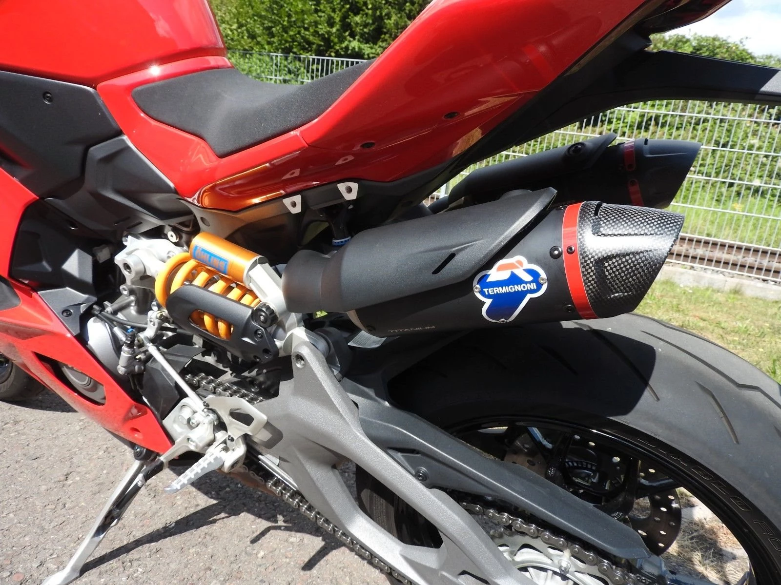 Es sind Termignoni-Endschalldämpfer (orig. Ducati mit e-Nummer) verbaut!