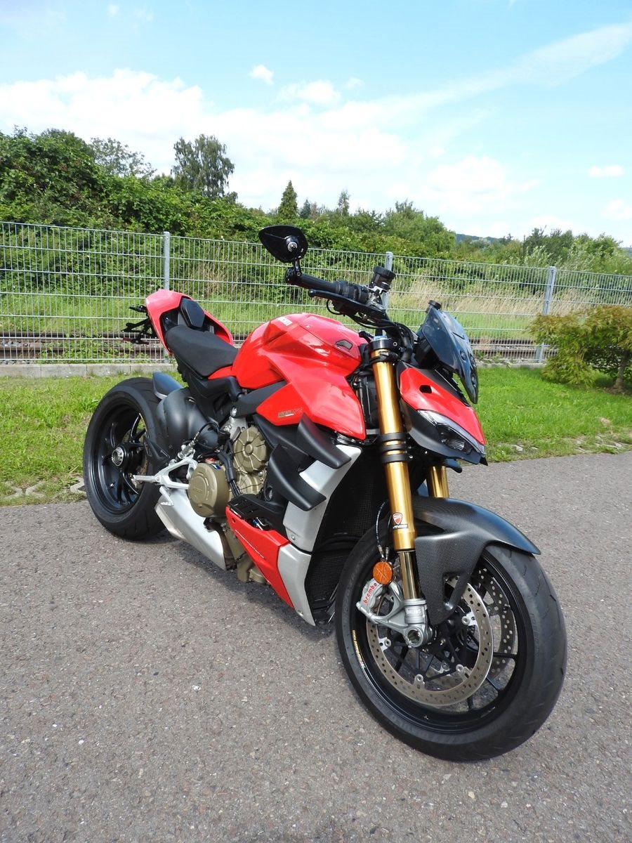 Zum Verkauf steht ein DUCATI Streetfighter V4S (rot) aus dritter Hand mit einer Gesamtfahr-