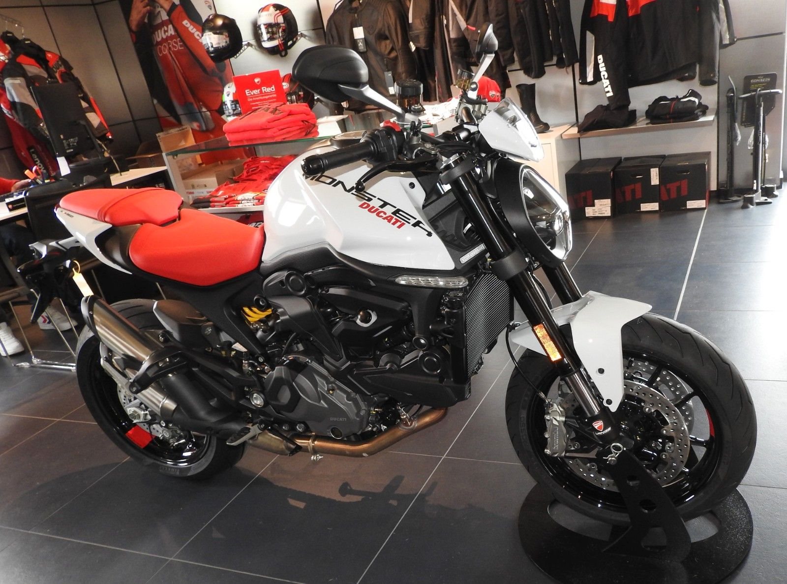 Zum Verkauf steht eine DUCATI Monster+ (Neufahrzeug, Iceberg White).